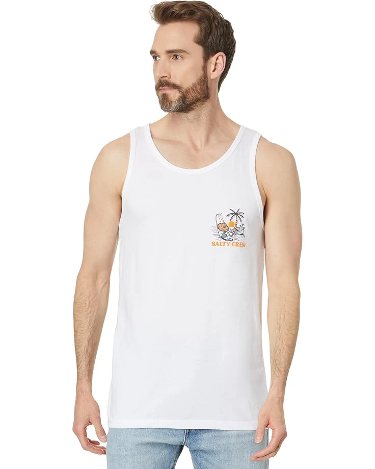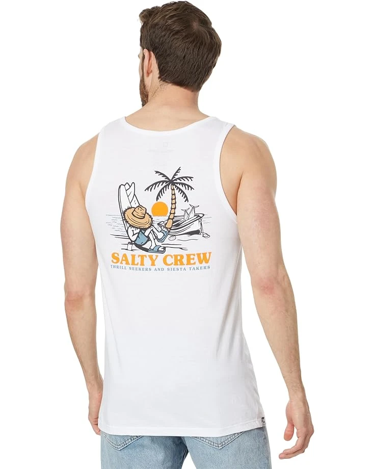 - Comfy and casual, the Salty Crew® Siesta Tank is perfect to elevate your everyday look. The pull-on style tank has a crew neckline, sleeveless construction, and a straight hem. It features a brand logo with a graphic print on the left chest and an elaborate one at the back that adds a statement finishing touch. Pair this tank with shorts or boxers for a comfortable and stylish look.